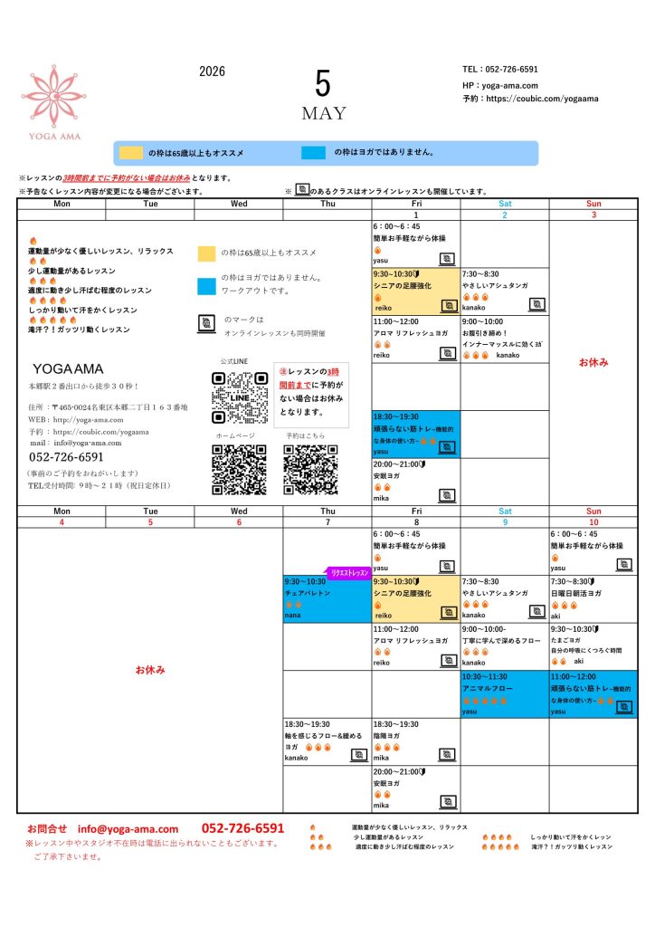 5/22(金) 9:30~10:30 【代行レッスン】バランスを調えるYoga(椅子も使います) kinko